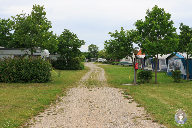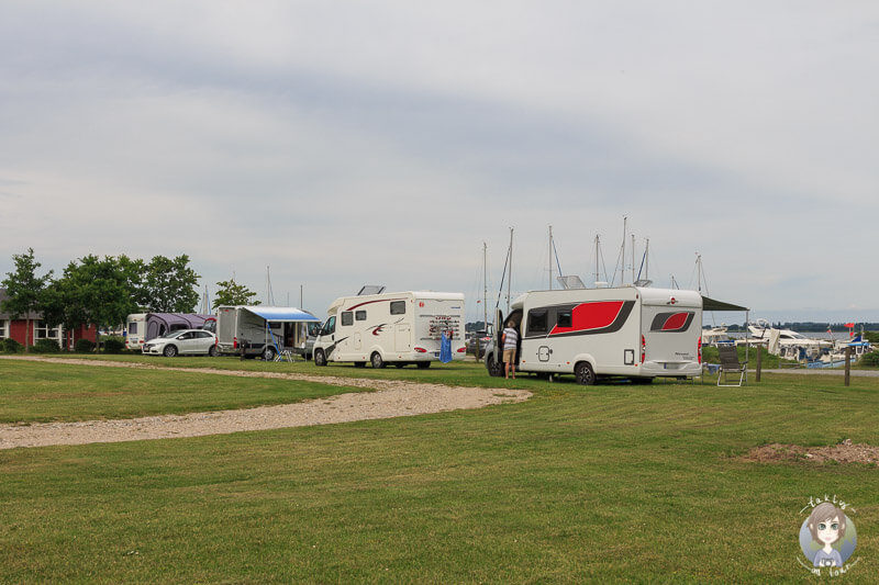 Die Stellplätze sind sehr gepflegt und liegen auf mehreren Wiesen verteilt. Durch zentrale Stromkästen ist die Versorgung auf dem ganzen Platz gewährleistet. Zwischen den einzelnen Plätzen ist angenehm Platz. In den ersten beiden Reihen gibt es einen schönen Ausblick auf die Marina. Es gibt sowohl Sonnen-, als auch Schattenstellplätze. Wohingegen die vorderen Stellplätze zur Marina hin liegen, grenzt an die hinteren Plätze ein großes Waldgebiet.