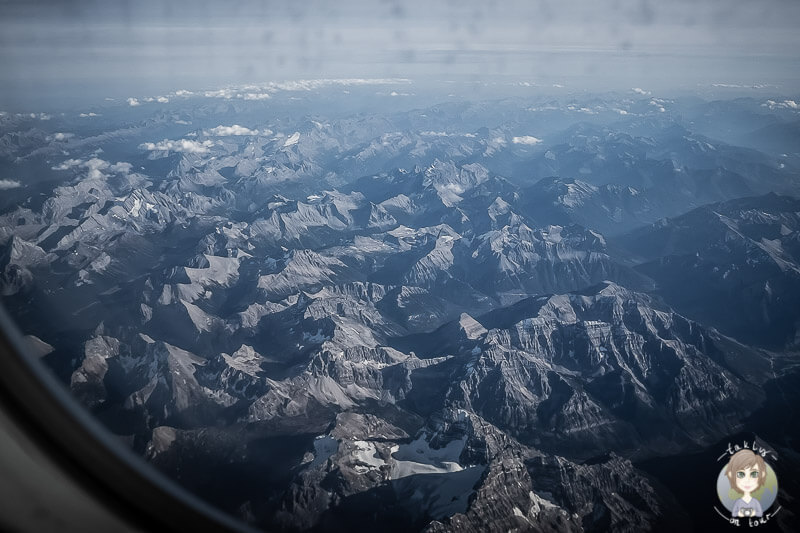 In Calgary hatten wir eine kurze Zwischenlandung, wo wir zum Glück sitzen bleiben konnten. Etwa die Hälfte der Passagiere stieg aus und nach etwa einer halben Stunde ging es für uns wieder in die Luft. Die letzte Stunde wurde uns nun mit dem freien Blick auf die Rocky Mountains versüßt. Was ein Ausblick. Außerdem wissen wir jetzt auch, wieso Kanada Land der tausend Seen genannt wird. Überall schimmern zahlreiche blaue oder grüne Seen, der unterschiedlichsten Größen.