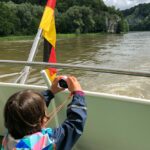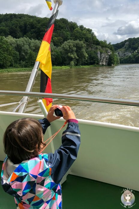 Der Donaudurchbruch im Altmühltal liegt an der tiefsten und – mit 80 Metern Breite – zugleich engsten Stelle der Donau in Bayern. Das faszinierende Naturschauspiel findet sich an Fluss-Kilometer 2.418,2. Die Donau ist interessanterweise in der gesamten Länge mit Kilometerangaben gekennzeichnet. Die Felsen ragen hier links und rechts empor und bieten einen faszinierenden Anblick. Sie sind unterschiedlich geformt und wenn du genau hinschaust, bekommst du vielleicht sogar die Heiligenfigur vom Wasserschutzpatron Nepomuck zu Gesicht. Milana hat sie gleich erkannt. Wenn du wiederum genau hinhörst, wirst du auf der Schifffahrt durch den Donaudurchbruch erfahren, wofür die 65 eisernen Ringe an der „Langen Wand“ waren, die heute noch erkennbar sind.
